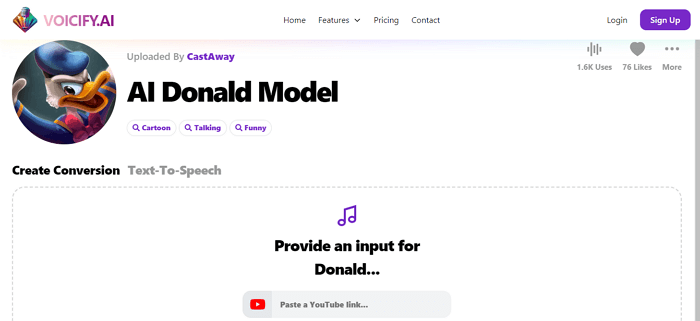 Voicify.AIär en annan AI-driven online Donald Duck röstgenerator för att ändra din röst. Den är också designad för att skapa AI-omslag med dina favoritröster.
