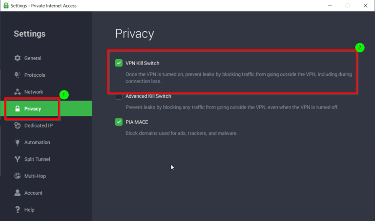 - Klicka på "Privatliv", kontrollera sedan "VPN Kill Switch.” Om PIA-anslutningen av misstag avbryts döljer detta din IP-adress utanför USA från YouTube TV-moderatorer.