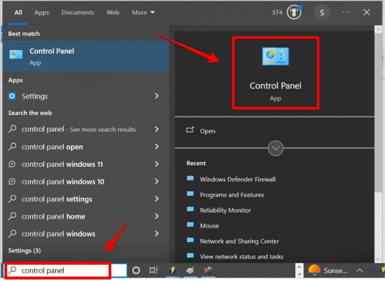 - Sök efter "Kontrollpanelen, klicka sedan på appen för att öppna den.