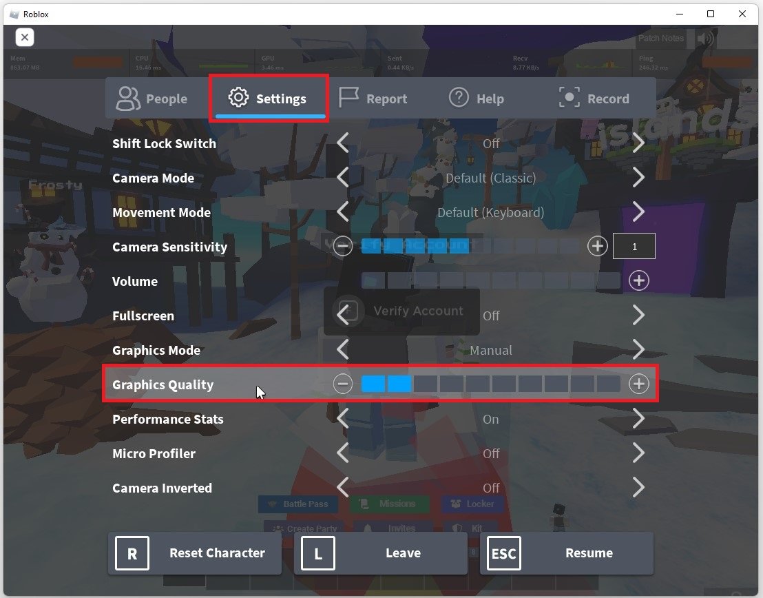 Först och främst kommer vi att ta en titt på dina Roblox-inställningar i spelet. Starta ett Roblox-spel och öppna dittInställningar. Här, ändra dinGrafiklägefrånAutomatisktillManuell. Nedan, minska dinGrafikkvalitetinställning från1-4fästingar. Detta kommer till stor del att bero på dina tillgängliga processor- och grafikresurser. Nedan, aktiveraPrestandastatistikalternativ för att se din nuvarandeMinnesanvändning,CPUochGPUanvändning och annan nätverksrelaterad statistik som är nödvändig för att felsöka prestandaproblem.