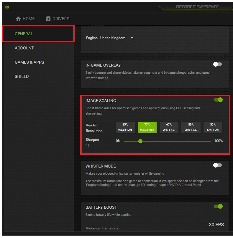 GeForce Experience > Allmänna inställningar > Bildskalning