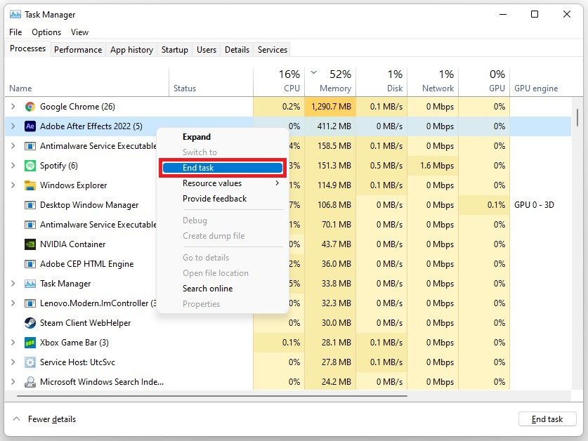 För att minska CPU-användningen från andra program föreslår vi att du avslutar vissa program från att köras i bakgrunden, vilket du inte behöver när du spelar spelet. Men se till att bara avsluta program från att köras som du vet inte kommer att skada ditt operativsystem.
