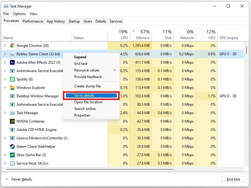 Låt Roblox vara igång och öppna upp dinTask Manager. I denProcesserhögerklicka på Roblox och välj att gå tillDetaljer.