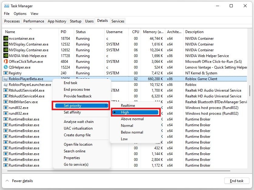 I denDetaljerfliken, ska programmet RobloxGameClient.exe vara markerat. Högerklicka på den och ställ inPrioritettillHög. Detta kommer att tilldela mer resurser för att spela spelet och bör öka din prestanda, särskilt om du har andra program som körs i bakgrunden.