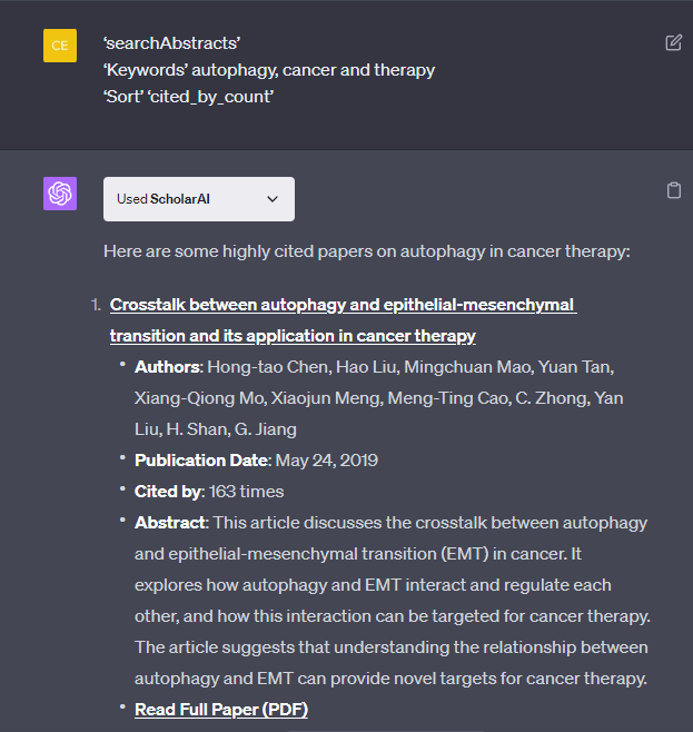 searchAbstractsfunktion, mata in dina fokuserade nyckelord för att söka i stora vetenskapliga resurser. Till exempel inputsearchAbstracts plants and insects coevolutionför att få nya artiklar om denna interaktion.ScholarAI-pluginet tar en stund att leverera de senaste publikationerna om ditt ämne, komplett med viktig information som författarna, sammandraget och publiceringsdatumet.