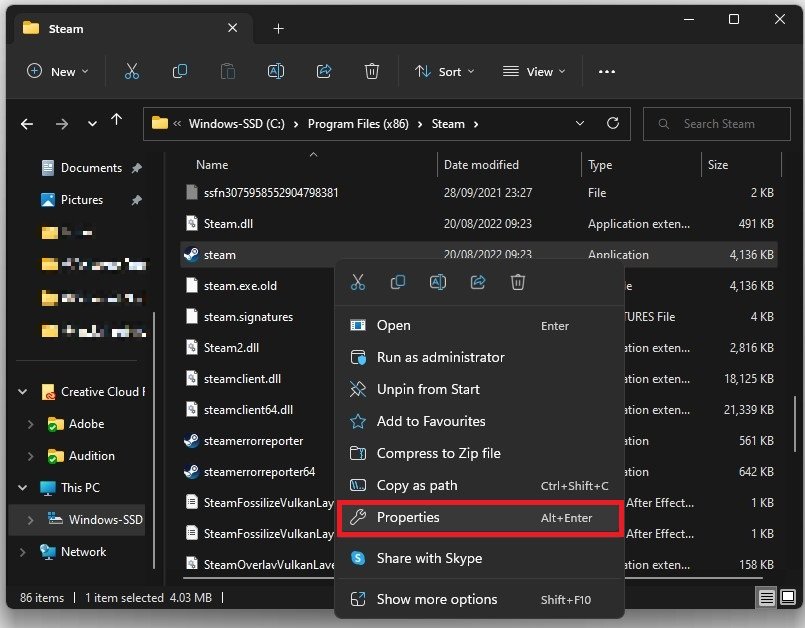 Om du fortfarande får VAC-felet, stäng din Steam-starter och öppna din filutforskare. Navigera till enheten där du installerade startprogrammet,Programfiler > Steam. Högerklicka här på Steam-applikationen och väljEgenskaper.