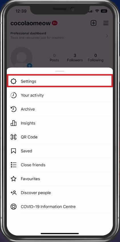 Öppna först din Instagram-applikation och navigera till din profil. Härifrån trycker du på hamburgermenyikonen uppe till höger och väljerInställningar.
