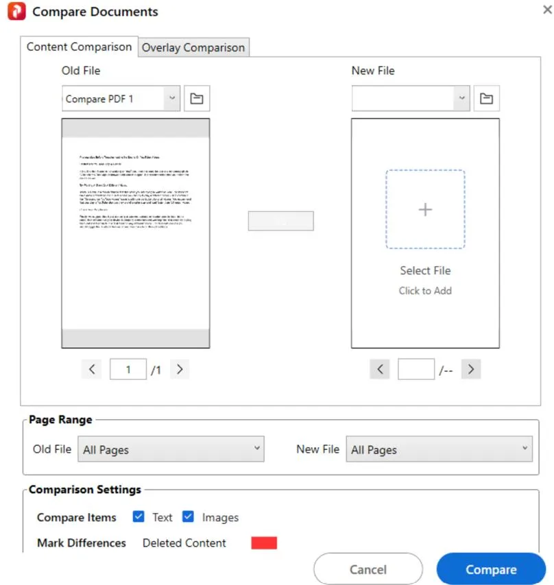 - Välj sedan den andra PDF-filen som du vill jämföra genom att klicka på knappen "+" under avsnittet Ny fil.