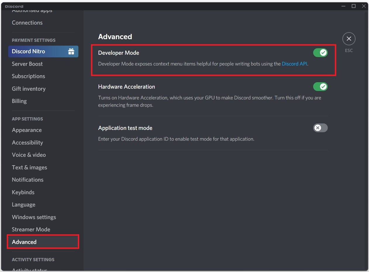 Discord-inställningar > Avancerat > Utvecklarläge