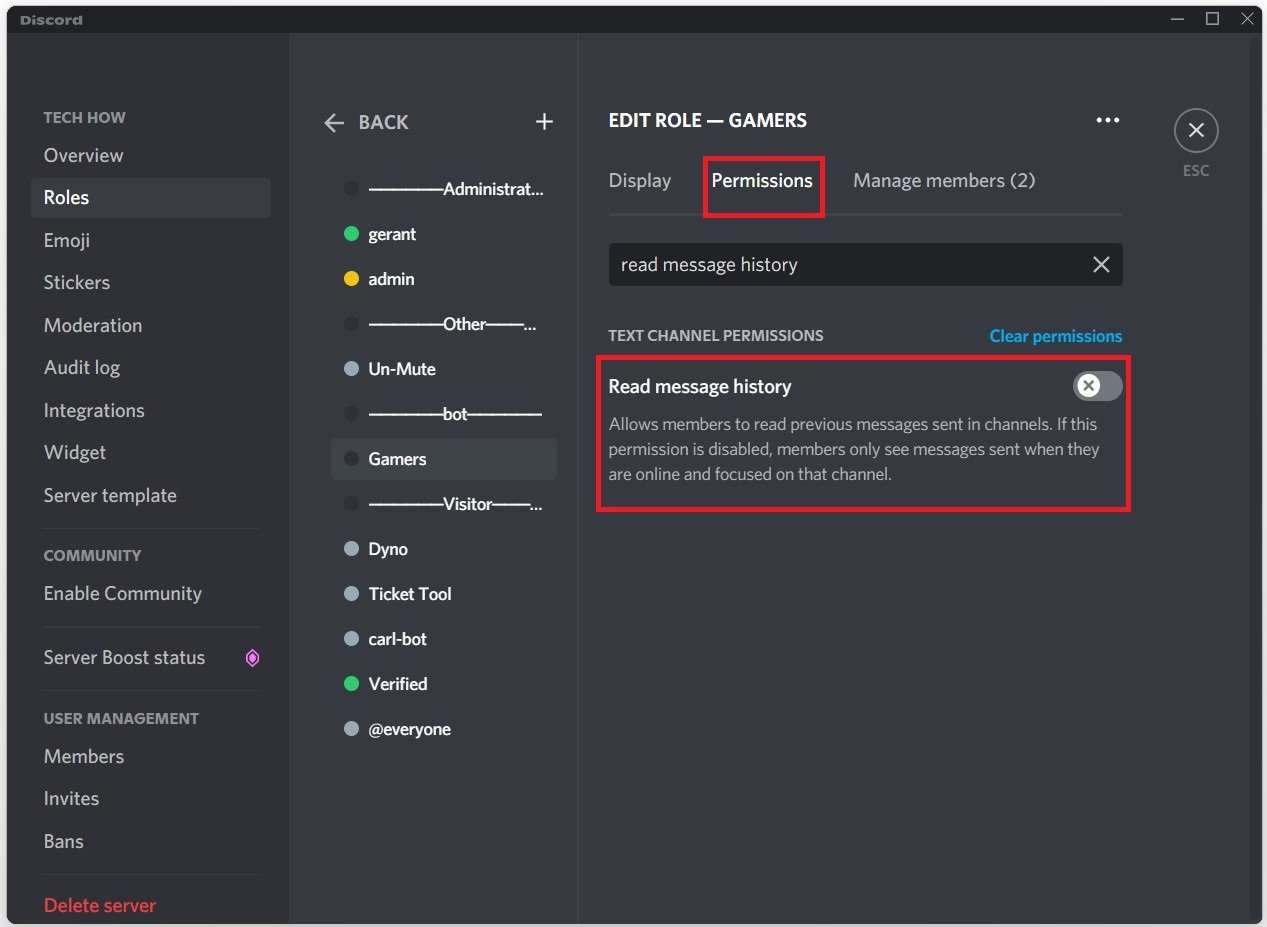 Discord-rollinställningar > Behörigheter > Läs meddelandehistorik