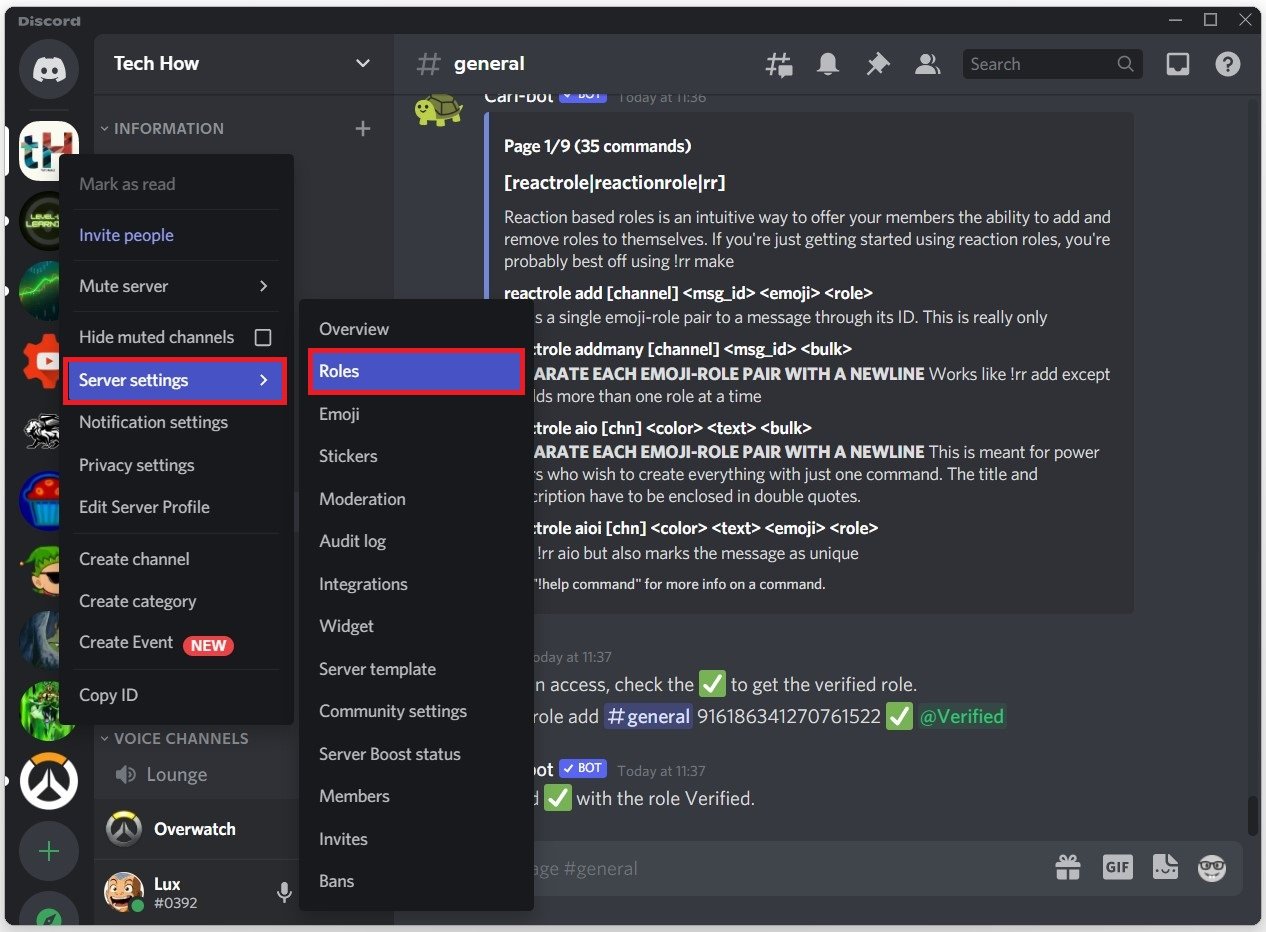 När du klickar på bockikonen ser du att du kommer att läggas till i rollen Verifierad. Slutligen, navigera tillbaka till dina serverinställningar och underRoller, se till attBehörighet att läsa meddelandenär aktiverat för rollen @alla. Annars kommer användare inte att kunna veta hur man blir verifierad, eftersom de inte kommer att se botens meddelande.