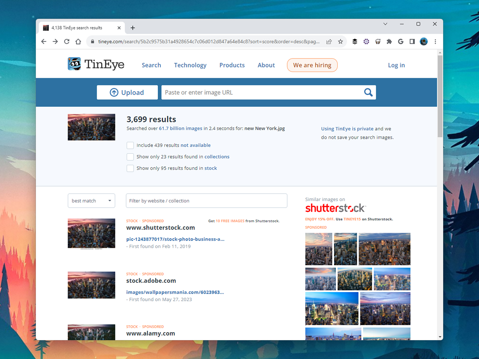 Vill du inte använda en av de stora sökmotorerna? TinEye är ett bra alternativ. Skärmbild: TineyeEtt annat användbart verktyg för omvänd bildsökning ärTinEye. Precis som med Google och Bing kan du komma åt sökrutan via en dator eller mobil webbläsare. Du kan också spara dig själv att skriva genom att hämta plattformensförlängning, tillgängligt för Chrome, Firefox, Edge och Opera.