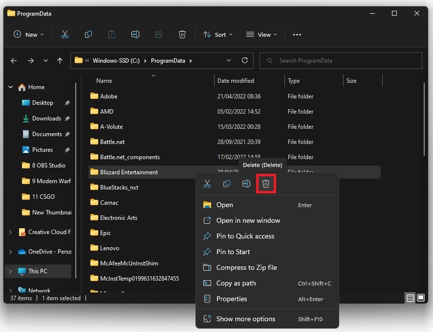 En ny mapp öppnas. Ta bort Blizzard Entertainment-mappen, som innehåller din BattleNet-cache, och öppna spelstartaren igen.