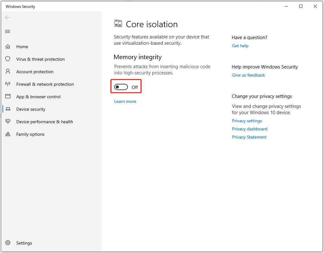 Steg 2. Stäng av alternativet under "Minnesintegritet".