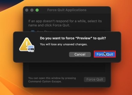 Om du har problem med att starta en specifik applikation eller om appen kraschar slumpmässigt, bör du först och främst tvinga avsluta processen på din Mac. För att göra det kan du använda genvägskommandot och Q medan appen är vald eller klicka på Apple-ikonen längst upp till vänster på skärmen och väljTvinga avslut.
