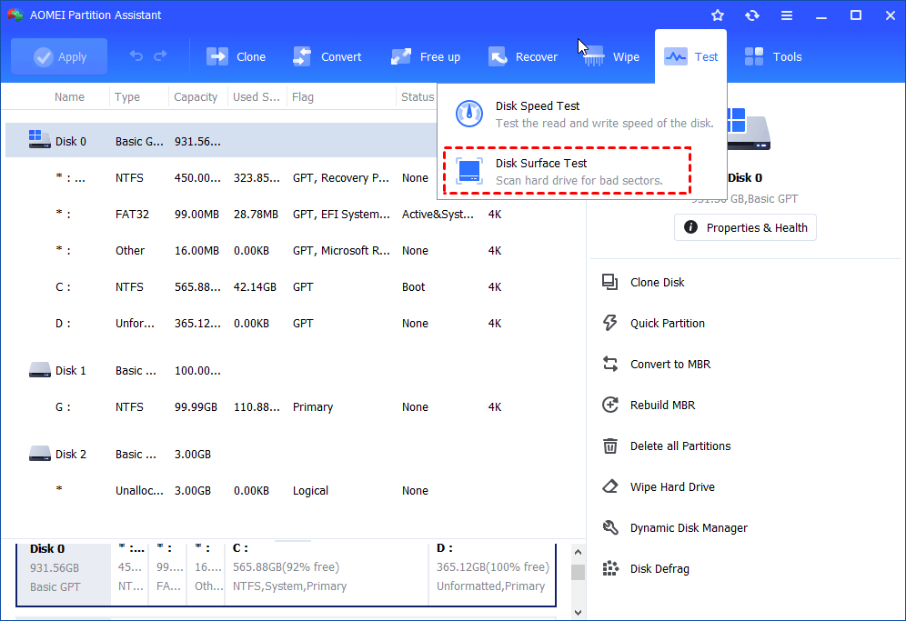 Steg 1. I huvudgränssnittet, klicka på "Test"-menyn och välj "Disk Surface Test".