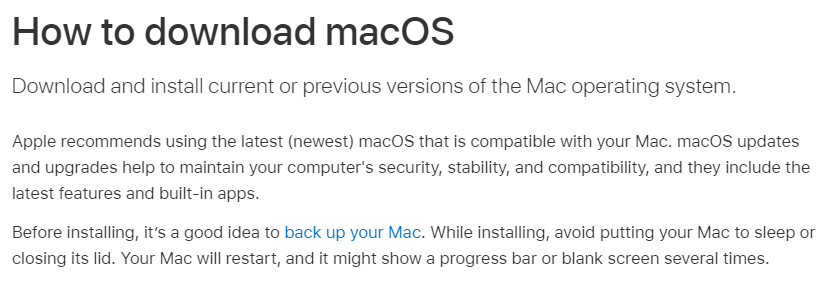 Om din enhet är inkompatibel måste du först installera en tidigare Mac OS-version. den "Hur man laddar ner macOS” Apples supportsida omdirigerar dig till den Mac OS-nedladdning du väljer. Efter att ha laddat ner dmg.-filen kan du fortsätta med installationen.