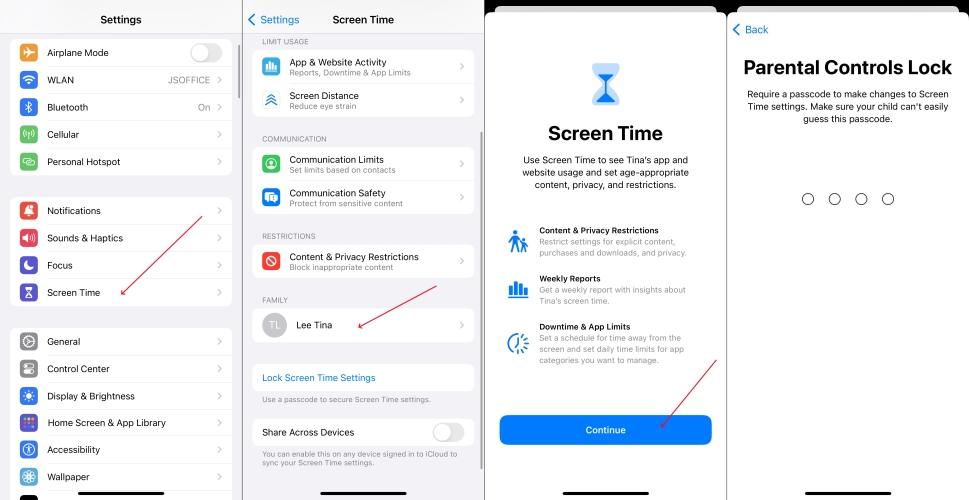 Om du använder Familjedelning för att hantera ditt barns konto kan du inte hitta alternativet för återställning av lösenord på barnets enhet. Utför nu följande steg på din enhet för att återställa det glömda lösenordet för skärmtid för ditt barn.