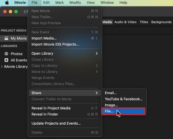 För att snabbt åtgärda exportfelet du får bör du först och främst se till att ditt iMovie-projekt är sparat. Klicka sedan påFili menyraden och navigera tillDela>Fil.
