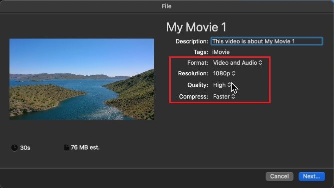 Klicka påNästa, och välj en filplats på din Mac med tillräckligt med lagringsutrymme kvar. När du fortfarande har problem med rendering och export med iMovie, se till att ditt projekt är sparat och stäng iMovie tills vidare.