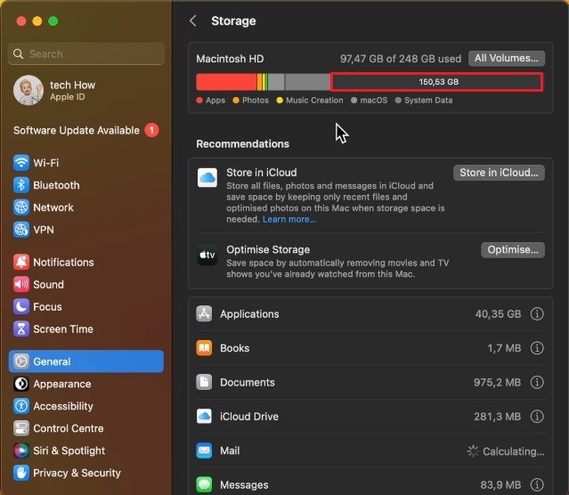 I denAllmäni dina inställningar, väljLagring. Det kan ta några sekunder att ladda din lagringsinformation, och du kan sedan förhandsgranska om du har tillräckligt med lagringsutrymme kvar för den uppskattade projektfilstorleken. För att snabbt frigöra lite utrymme, töm din papperskorg och radera tidigare nedladdade filer som du inte längre behöver.