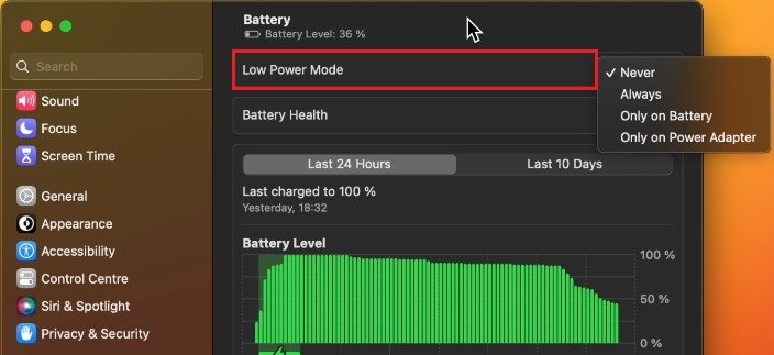 Därefter, om du använder en bärbar dator, till exempel en MacBook Pro eller MacBook Air, navigera tillBatteriavsnitt av dina inställningar. Se till attLågeffektlägealternativet är inställt påAldrig. Lågströmsläget minskar din totala systemprestanda och kan orsaka exportfel med iMovie.