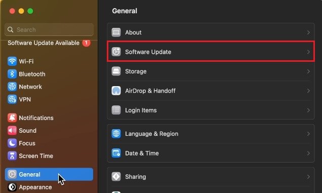 När detta är gjort, medan du fortfarande är i dina inställningar, navigera tillAllmänavsnitt och klicka påProgramuppdatering. Att uppdatera din Mac då och då rekommenderas, särskilt om du upplever fel och andra problem. Du kommer att uppmanas att starta om din Mac när uppdateringen har laddats ner.