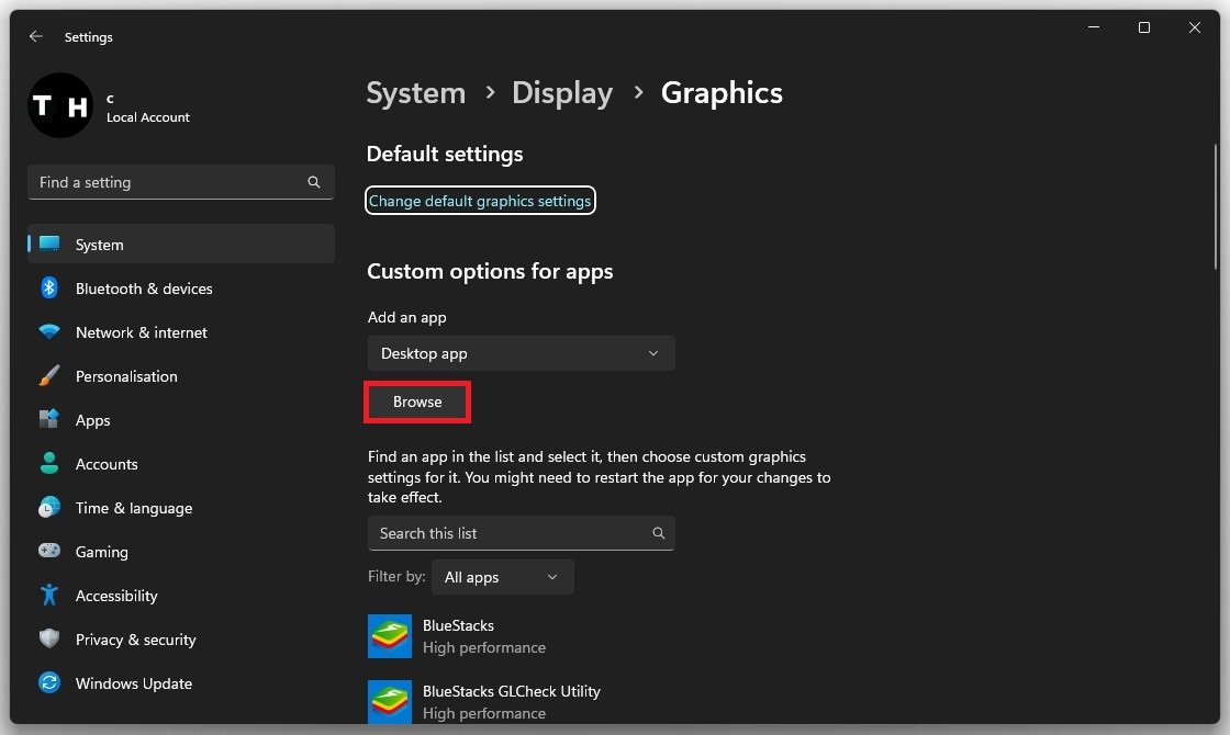 Därefter kommer vi att ändra några Windows-grafikinställningar för Fortnite när vi klickar påGrafikrelaterad inställning. Här, klicka vidareBläddra, och din filutforskare öppnas.