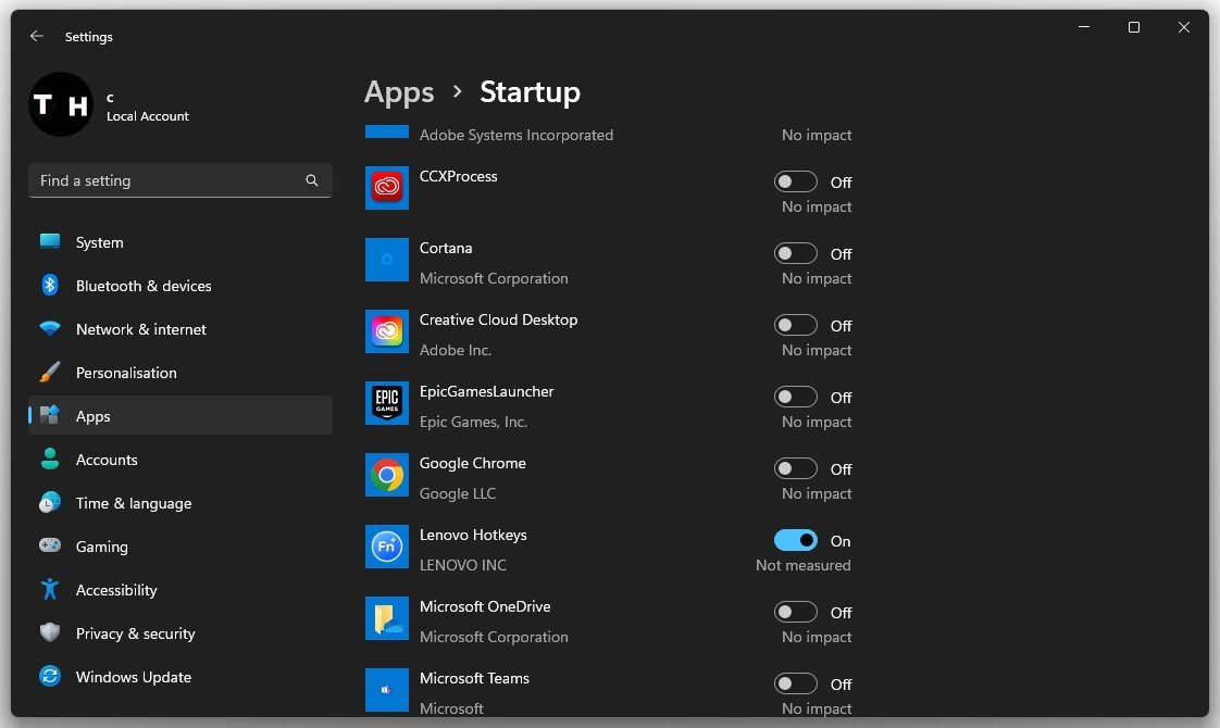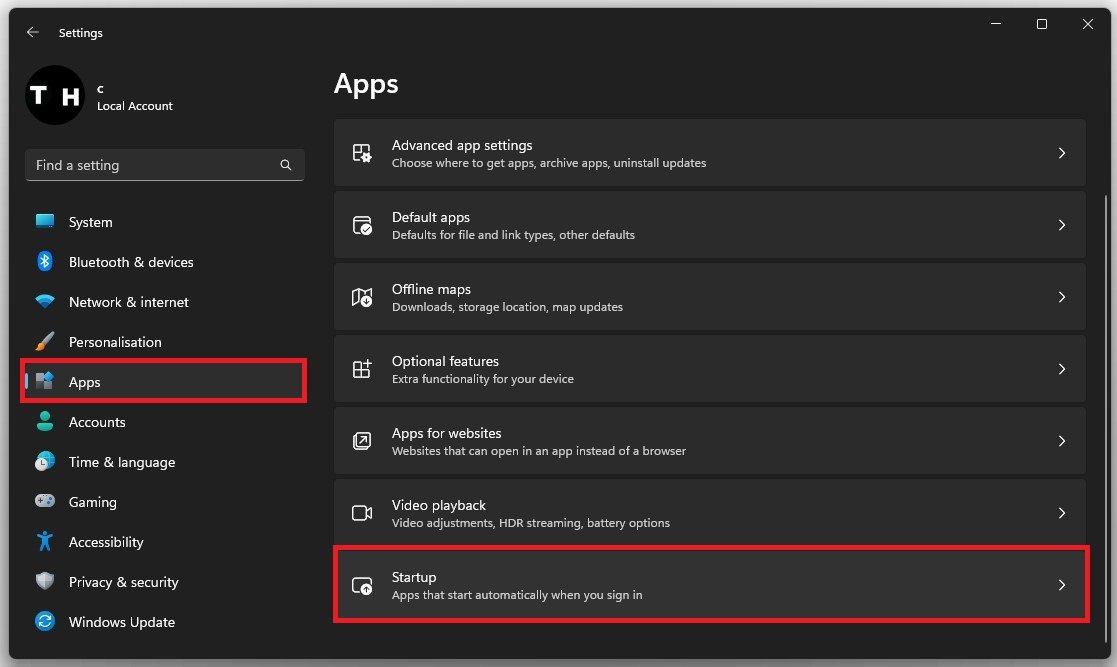 I dinApparinställningar, navigera tillUppstart,och här bör du inaktivera applikationer som startar upp som du inte använder dagligen. I mitt fall inkluderar dessa Steam eller Discord.