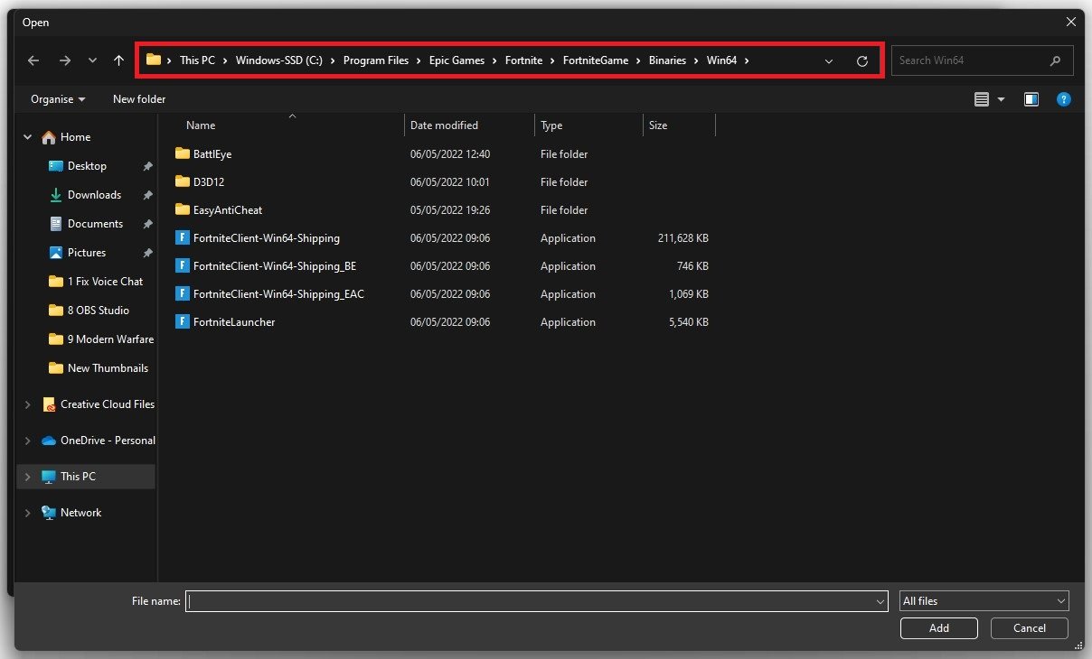 Härifrån måste du hitta Fortnite.exe-applikationen. Filsökvägen för min installationsplats är Program Files > Epic Games > Fortnite > FortniteGame > Binaries > Win64. VäljFortniteClient-Win64-fraktapplikation med den största filstorleken och klicka påTillägga.