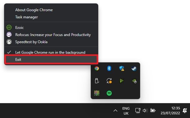 Stäng först din Chrome-webbläsare och förhindra att den körs i bakgrunden. Öppna systemfältet, högerklicka påGoogle Chromeikonen och väljUtgång.