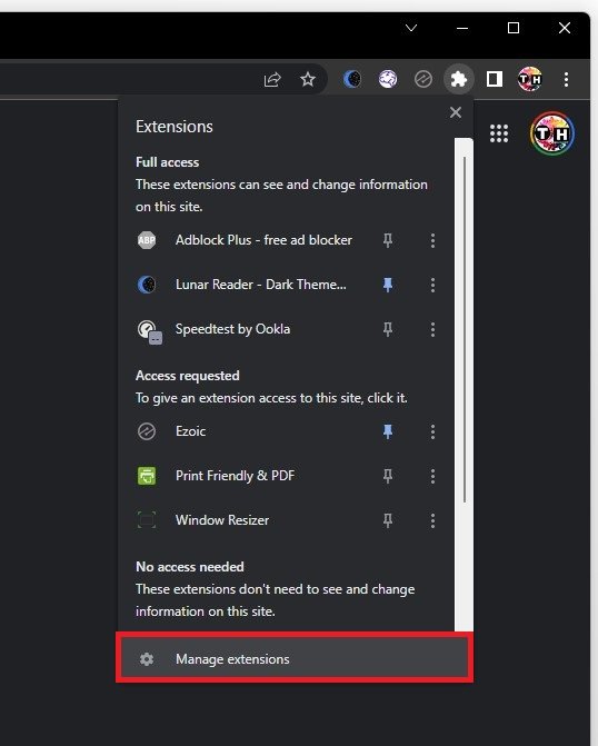 Du kan sedan öppna webbläsaren Google Chrome och testa om problemet har lösts. Om problemet kvarstår klickar du på tilläggets ikon och väljerHantera tillägg.