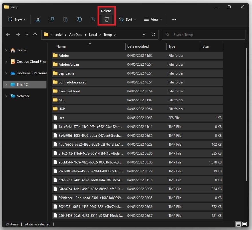 En ny mapp kommer att öppnas, som innehåller alla dina temporära filer, som sparas av dina applikationer och bör raderas då och då. Du kan säkert ta bort allt i den här mappen, vissa filer kan finnas kvar, så lämna dem där.