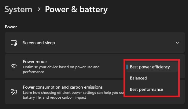 Om problemet kvarstår, gå tillbaka till dina inställningar. UnderSystem, klicka påStröm & batteri. I denDrivaavsnitt, ändra dinStrömläge. Detta är användbart om du har ett dedikerat grafikkort eller annan energikrävande hårdvara.