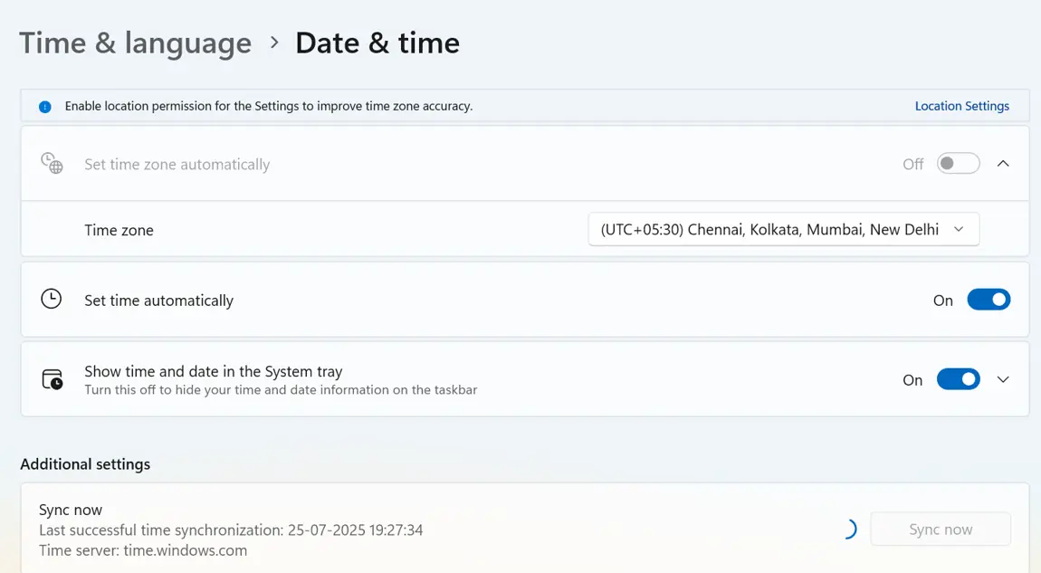 Om du har ställt in datum och tid manuellt kan du möta ChatGPT-felet. Vi rekommenderar att du kontrollerar data och tid på din PC och ändrar inställningarna till automatiska. Så här gör du det.
