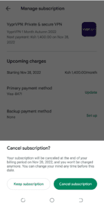 - Dina kommande avgifter visas på nästa skärm. Klicka på "Avsluta prenumeration.”