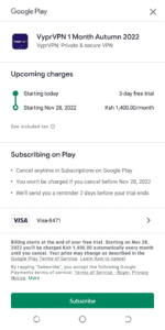 - Dina kommande avgifter kommer att visa att din kostnadsfria provperiod börjar i dag och slutar efter tre dagar på skärmen. Tryck på "Prenumerera.”