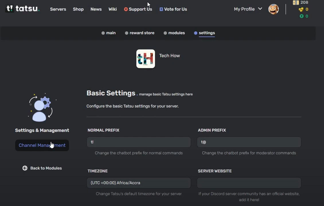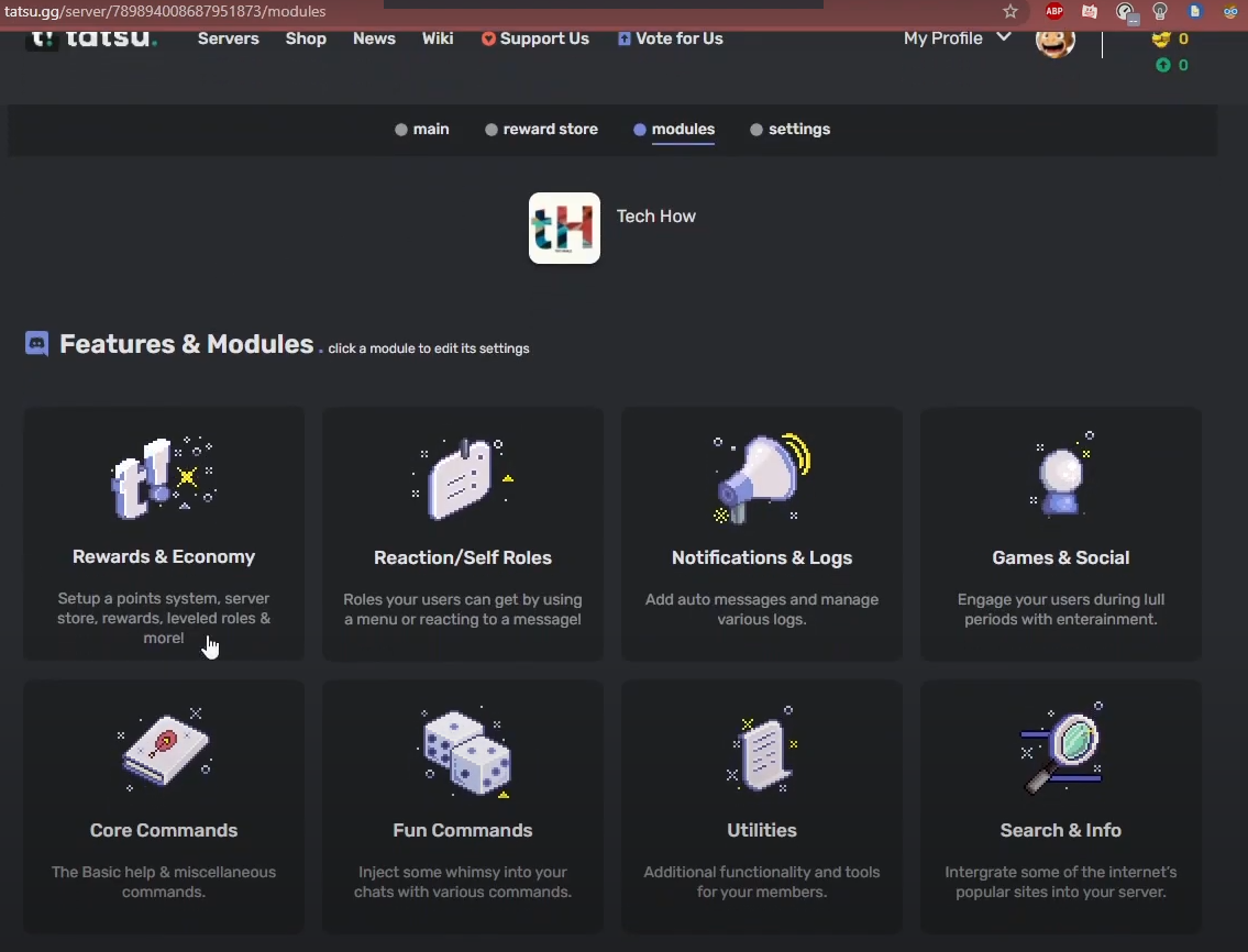 För att anpassa dina botinställningarklicka härför att komma till Tatsu-kontrollwebbplatsen. Du kan ändra ditt rangkort, plånbokskort och serverinventering i dina huvudinställningar.Under Modules, ellerFunktioner och moduler, kan du förhandsgranska och ändra inställningarna för alla kommandon du behöver för att använda boten på din server.