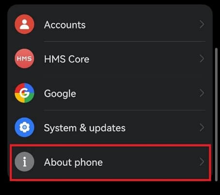 Steg 2.Rulla ned och tryck på "Om telefonen" eller "Om enheten."