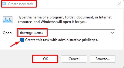 Steg 5: NärSkapa ny uppgiftpopup-menyn visas, använd markören för att klicka på utrymmet i fältet du ser och skriv "devror.msc.msc” i det fältet (utan citattecken)