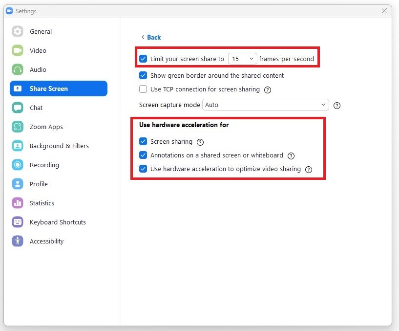 Navigera tillAvanceradinställningar. Om du upplever fördröjning när du delar din skärm, begränsa din skärmdelning till 10 eller 15 bilder per sekund. Detta kommer att minska belastningen på din nätverksanslutning och tillgängliga resurser för att dela din skärm. Alternativen för hårdvaruacceleration bör aktiveras nedan när du använder ett dedikerat grafikkort.