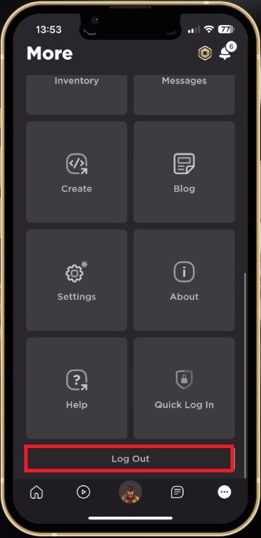 Öppna först Roblox-applikationen på din mobila enhet. Klicka här på hamburgermenyikonen längst ner till höger på skärmen. I denMermenyn, scrolla ner och tryck påLogga ut.