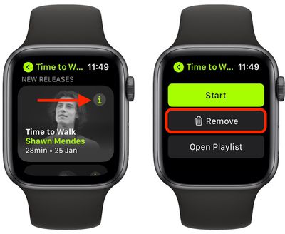 När du har slutfört ett Time to Walk-avsnitt tas det automatiskt bort från din Apple Watch. Om du vill ta bort ett avsnitt manuellt trycker du helt enkelt påinfoknappen på träningspasset, scrolla ner till botten och tryck sedan påTa bort.