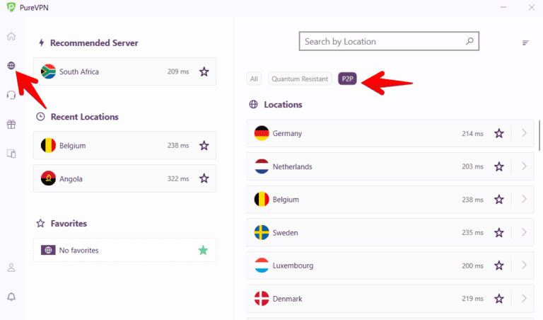 - Flera P2P-servrar på flera platser.PureVPN erbjuder P2P-stöd på flera av sina 6500+ servrar och har till och med en P2P-serversektion på sina PC-appar. Dessa servrar översätts till snabba uppladdnings- och nedladdningshastigheter, vilket gör dem idealiska för torrenting!