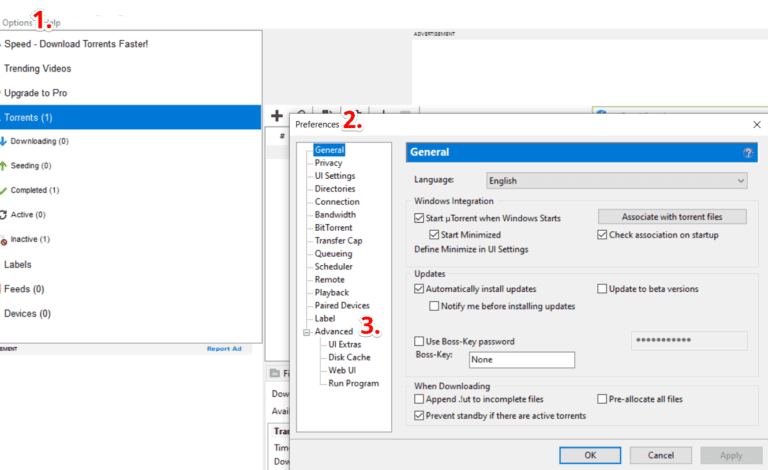 - Starta uTorrent och gå tillAlternativ>Inställningar>Avancerad.