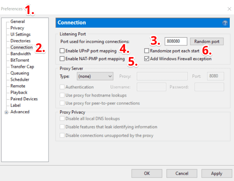 - Starta uTorrent och klickaAlternativ>Inställningar>Anslutningar.