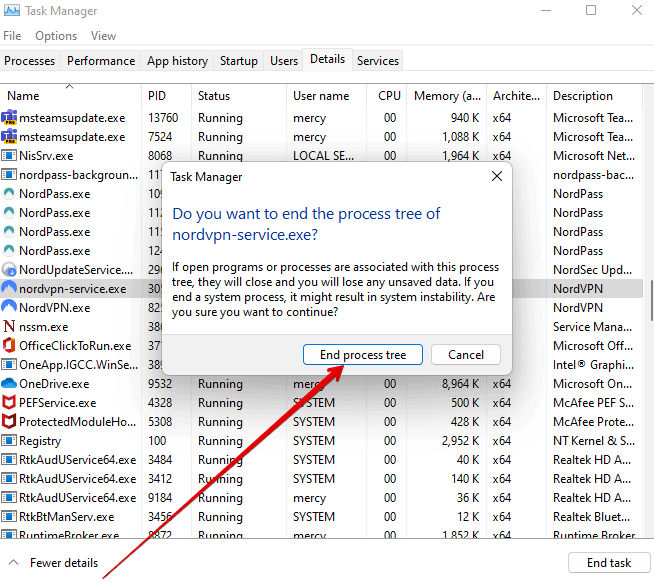 - Bläddra till "nordvpn-service.exe" och "NordVPN.exe.” Högerklicka och välj "Avsluta processträdet" för varje.
