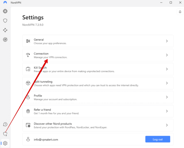 - PåNordVPN Windows-app, välj fliken Inställningar. Det är kugghjulsikonen längst ner till vänster i din Windows-app.