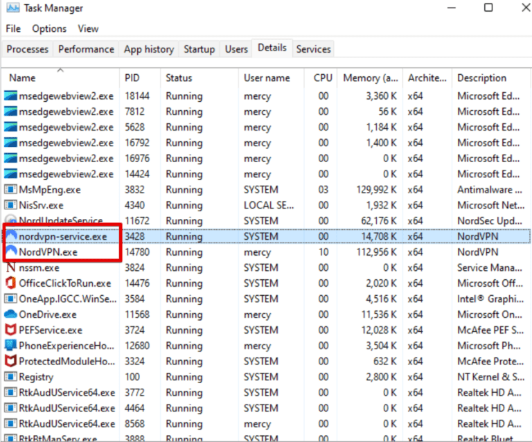 - Leta efter två aktiva processer på listan - "nordvpn-service.exe" och "NordVPN.exe.”