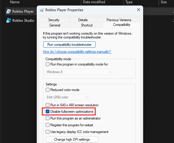 Sök efter Roblox i din startmenysökning, välj "Öppna filplats" och högerklicka på genvägen till Roblox Player för att komma åt dess egenskaper. På fliken Kompatibilitet, aktivera alternativet "Inaktivera helskärmsoptimeringar" och tillämpa dina ändringar.